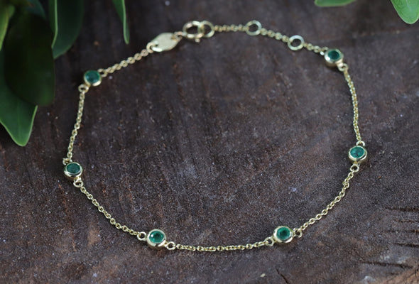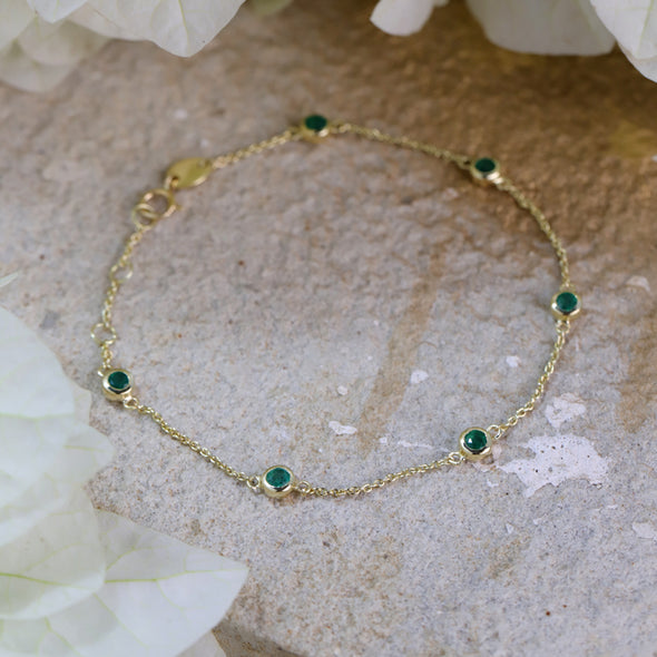 Das Armband ATHINA vereint zeitlose Eleganz mit hochwertiger Handwerkskunst. Gefertigt aus 9 Karat Gold, zieren sechs runde Smaragde von jeweils 3 mm Durchmesser (insgesamt ca. 0.6 ct) dieses filigrane Schmuckstück. Die Gesamtlänge beträgt 17 cm und kann durch zwei zusätzliche Verlängerungskettchen um jeweils 1 cm auf bis zu 19 cm erweitert werden.