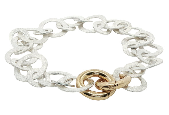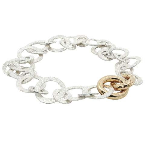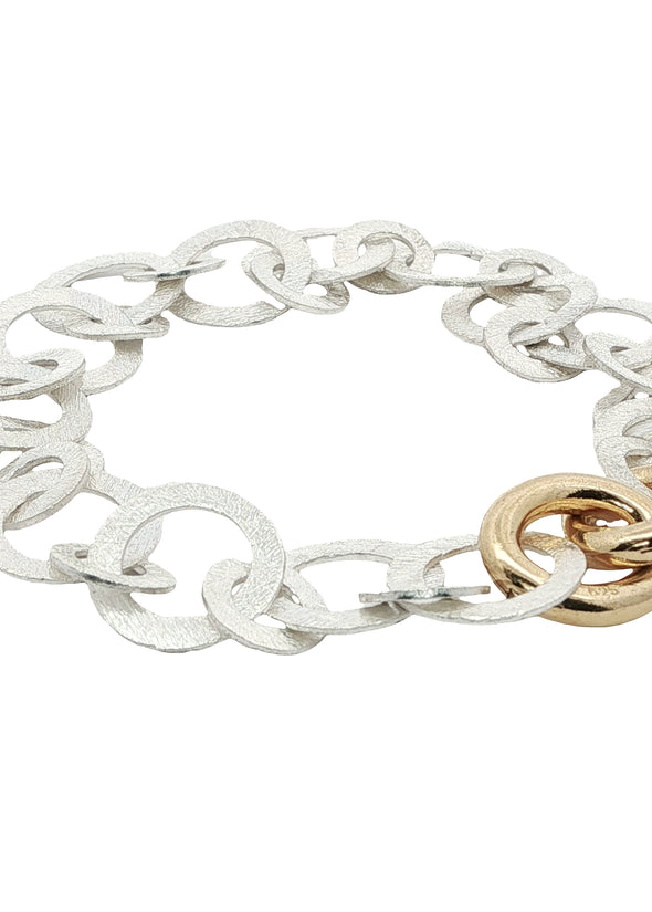 Die Komposition aus Kreisen in zwei Grössen – 14 mm und 8 mm – schafft ein ausgewogenes Spiel von Rhythmus und Leichtigkeit. Jedes Glied ist präzise verbunden, sodass sich das Armband sanft an das Handgelenk schmiegt und mit Bewegung lebendig wirkt.