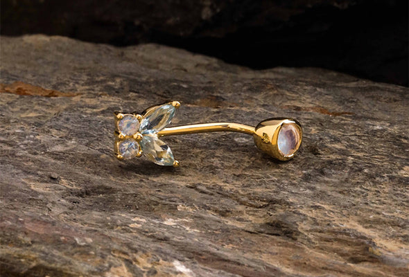 Dieses Piercing ist das perfekte Accessoire für alle, die Natürlichkeit und Luxus verbinden möchten. Der feine Schimmer des Mondsteins und das leuchtende Blau des Topas fangen das Licht auf einzigartige Weise ein – für einen bezaubernden Look zu jeder Jahreszeit.