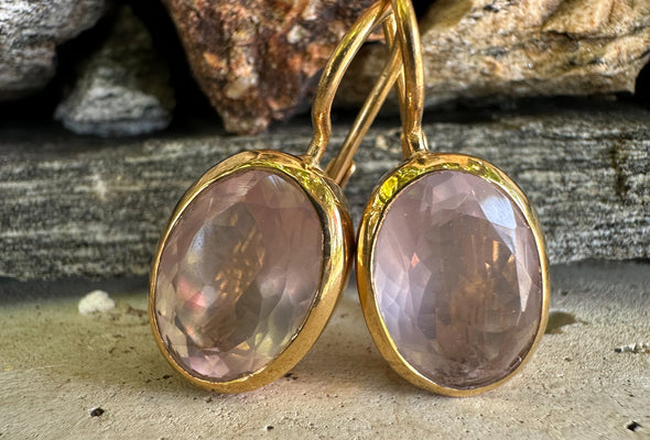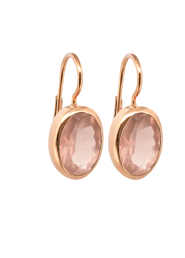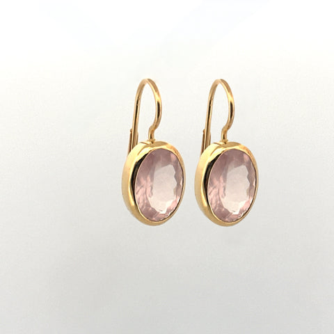 Diese eleganten Ohrhänger aus feinem Sterling Silber (925) präsentieren sich mit oval geschliffenen Rosenquarz-Edelsteinen in der Grösse 10 x 14 mm. Die Fassungen sowie der sichere englische Verschluss sind mit hochwertigem Gelbgold vergoldet, was den zartrosa Edelsteinen einen warmen, edlen Kontrast verleiht.