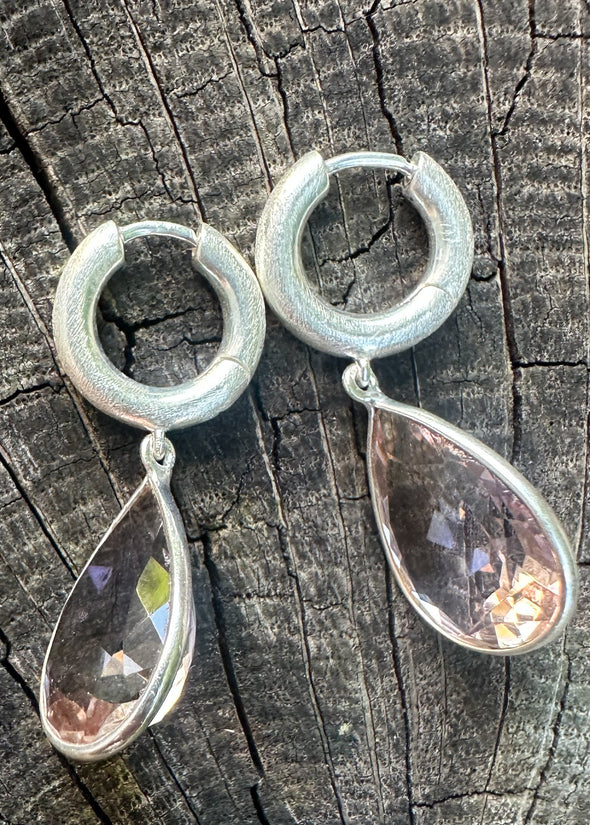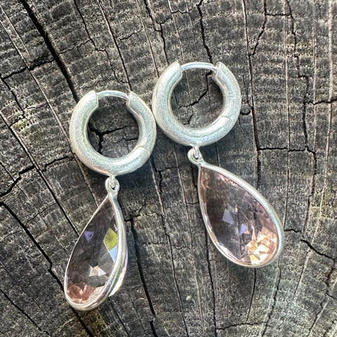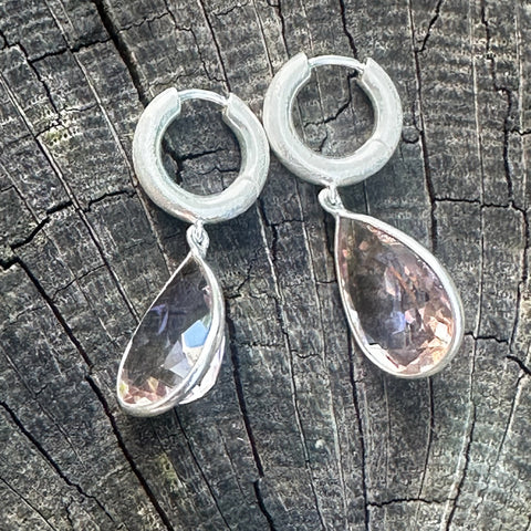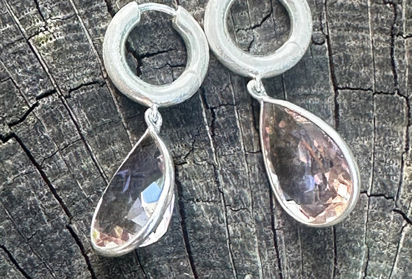 Moderne Creolen aus 925er Sterling Silber, edel Ice-mattiert für eine kühle, strukturierte Optik. Die Creolen (ca. 3 x 14 mm) tragen tropfenförmige Ametrin-Charms (ca. 12 x 16 mm), die in zarten Violett-Goldtönen schimmern – jedes Stück ein kleines Farbkunstwerk der Natur.