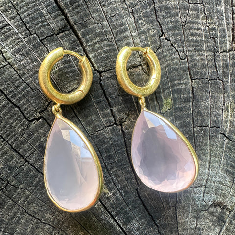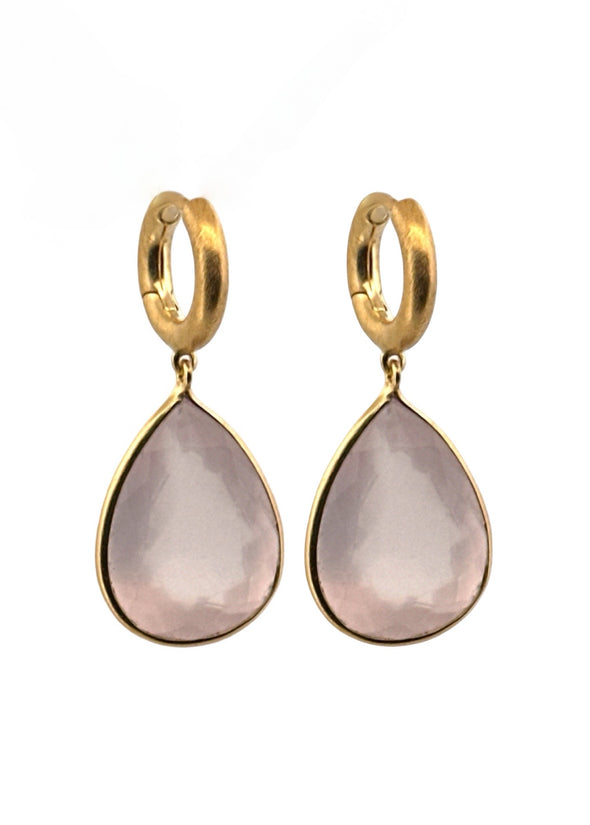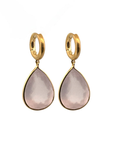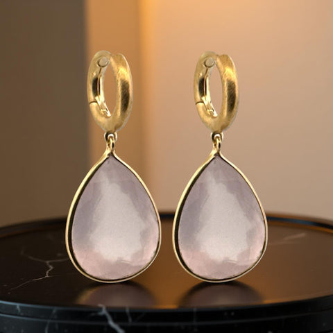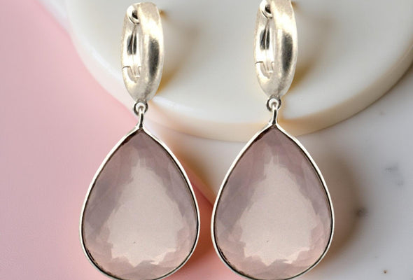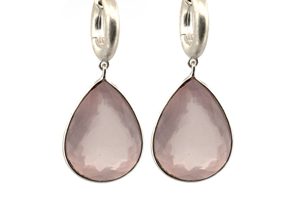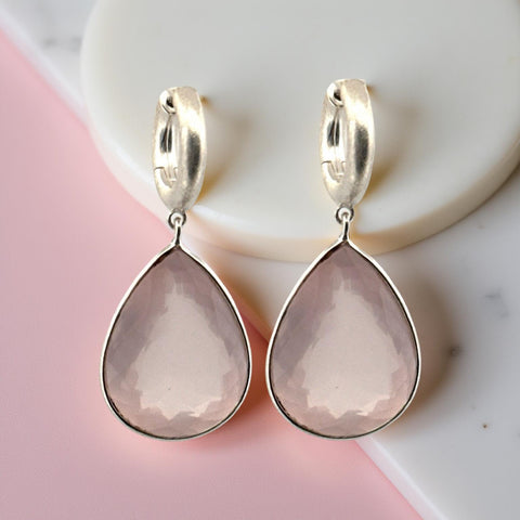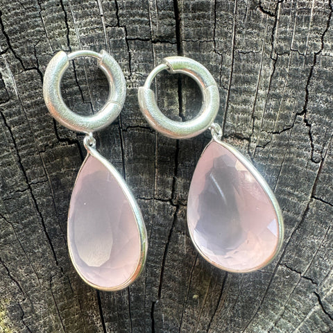 Ausdrucksstarke Creolen aus 925er Sterling Silber, mit edler Ice-Mattierung für einen modernen, kühlen Look. Die Creolen messen ca. 3 x 14 mm und tragen je einen grossen, tropfenförmigen Rosenquarz-Charm (ca. 15 x 20 mm) in zartem Rosé – ein harmonisches Spiel aus Form, Farbe und Struktur.