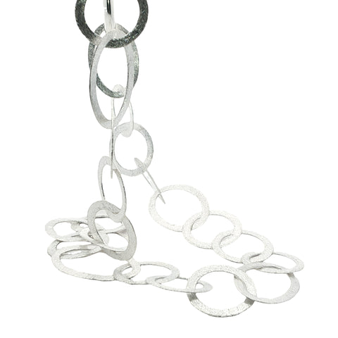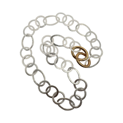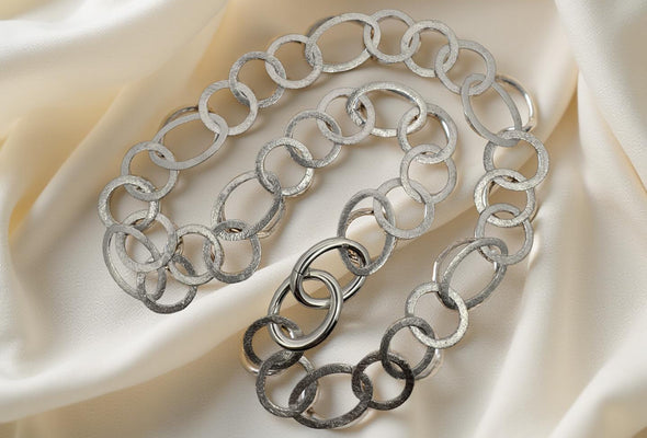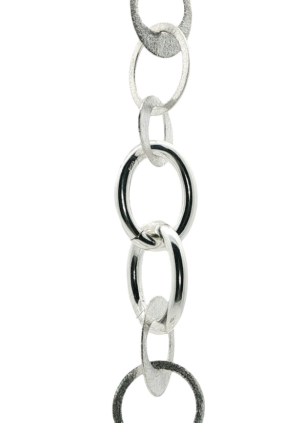 Die Kette besteht aus handgearbeiteten, mattierten Gliedern in wechselnden ovalen (17 × 24 mm) und runden Formen (17 mm) – eine harmonische Komposition aus Struktur und Rhythmus.