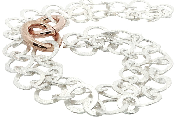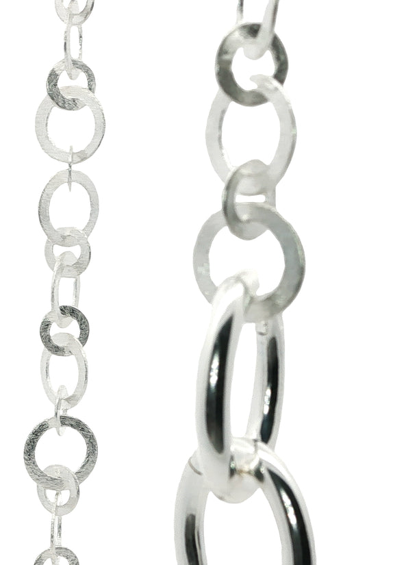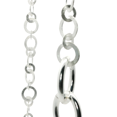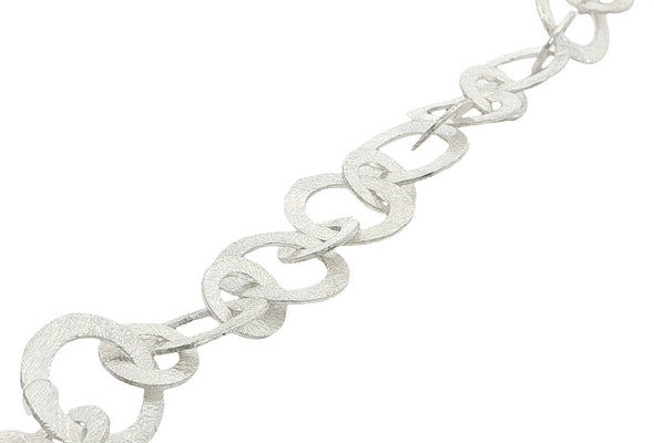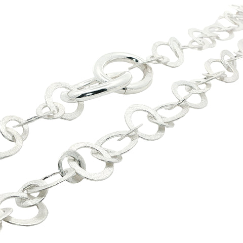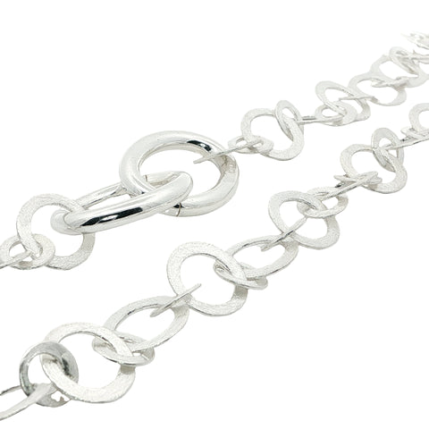 Abwechselnd angeordnete Kreise in 14 mm und 8 mm bilden ein harmonisches Gefüge aus Rhythmus und Balance – ein Wechselspiel aus Struktur und Leichtigkeit. Das Collier legt sich fliessend um den Hals und reflektiert das Licht in sanften, frostigen Nuancen.