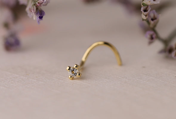 Zierlicher Nasenstecker, der perfekt auf der Nase sitzt. Nasen Piercing DIANA verzaubert das Gesicht mit einem feinem Diamanten oder Topasen in offener Krapfenassung, und ist klassisch genug, um jeden Tag getragen zu werden.