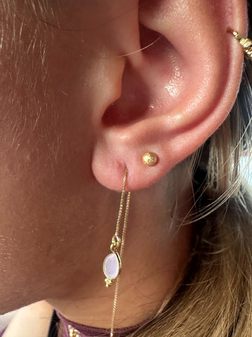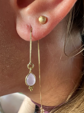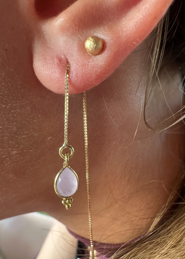 Diese zarten, langen Ohrhänger aus poliertem, gelbvergoldetem 925 Sterling Silber bringen feminine Leichtigkeit ins Spiel. An einer feinen Venezianer-Kette (ca. 1 mm) schwingt ein tropfenförmiger Chalzedon in sanftem Rosaton (ca. 5 x 7 mm) – ein dezenter Farbakzent mit edlem Glanz.