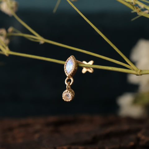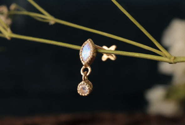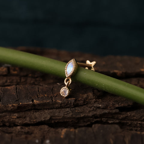 Das Piercing LIANNE strahlt in sanfter Eleganz – der schimmernde Mondstein verleiht ihm eine geheimnisvolle, feminine Aura. Jeder Stein reflektiert das Licht mit einem zarten, irisierenden Glanz, der an Mondschein erinnert.
