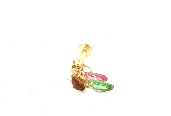 Das Piercing TRILL vereint zarte Eleganz mit modernem Design. Gefertigt aus hochwertigem, gelbvergoldetem 925 Sterling Silber, besticht es durch drei bewegliche Navett-förmige Charms (je ca. 3 × 5 mm) aus farbigen Turmalinen.