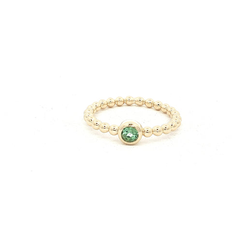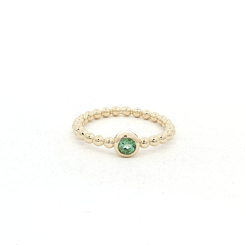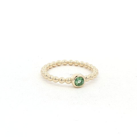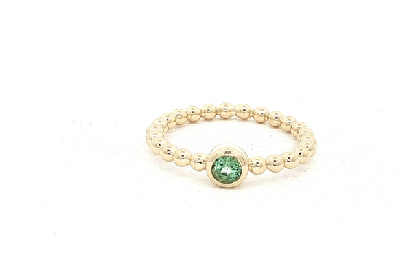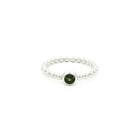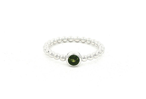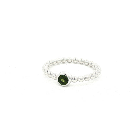 Der Ring BUBBLE ist aus feinstem Sterlingsilber gefertigt und zeichnet sich durch seine charakteristische Noppenstruktur in 3 mm Breite aus. In der Mitte funkelt ein runder, grüner Turmalin mit 4 mm Durchmesser, der dem Ring eine lebendige, natürliche Farbnote verleiht.