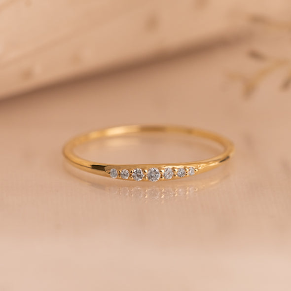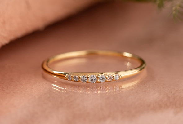 Der feine Ring EMILIA ist ein wahres Meisterwerk der Schmuckkunst, das durch seine filigrane Eleganz und luxuriösen Details besticht. Dieser Ring ist unten 1 mm und oben 1.8 mm breit, was ihm eine raffinierte und geschmeidige Form verleiht, die perfekt am Finger sitzt.