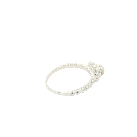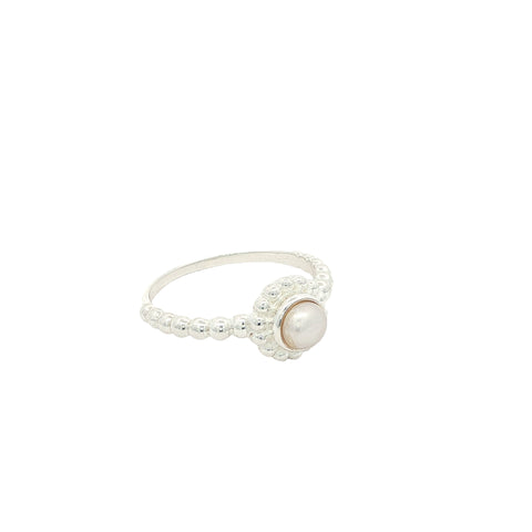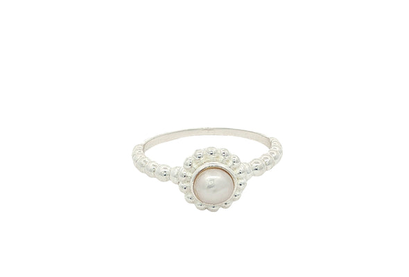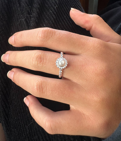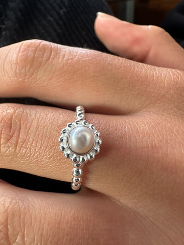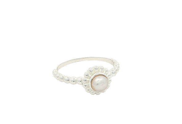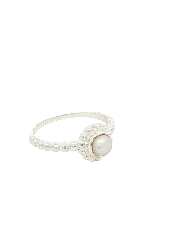 Ein feiner Sterling-Silber-Ring, der mit seiner verspielten Leichtigkeit begeistert. Die Front ist mit 2,5 mm grossen Kugeln besetzt, die sich harmonisch aneinanderreihen. Als Krönung schmückt den Ring eine 5 mm Süsswasserperle in einer geschlossenen Fassung, die ihm einen edlen und zugleich natürlichen Charakter verleiht.