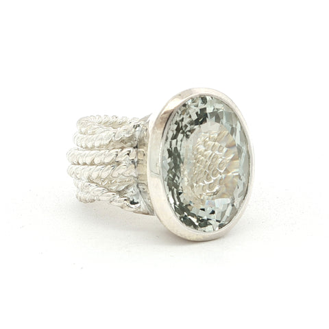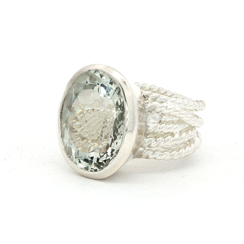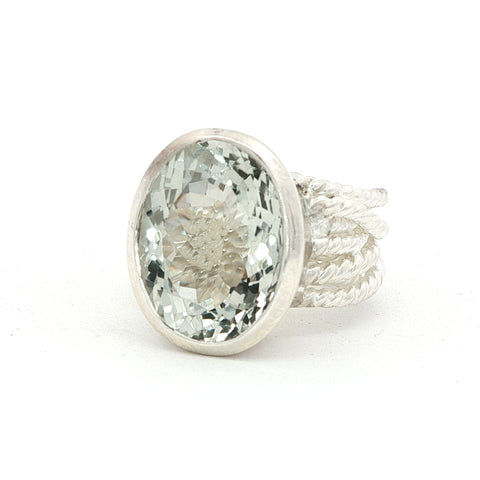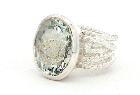 Als Mittelpunkt fasst der Ring einen grossen, ovalen grünen Amethyst (ca. 15 x 20 mm), dessen klarer, frischer Grünton und Facettenschliff das Licht wunderschön reflektieren.