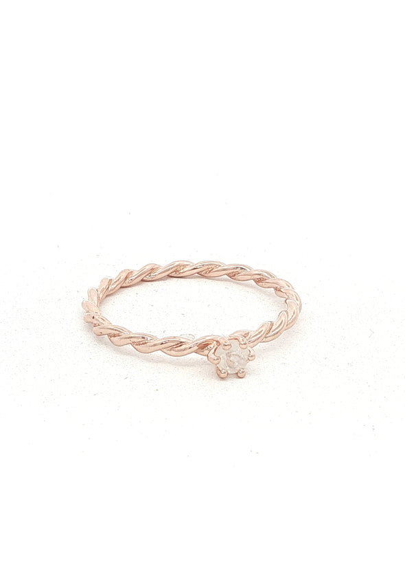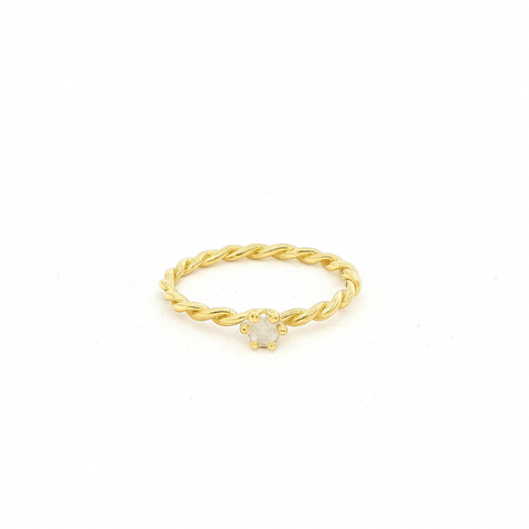 Im Mittelpunkt steht ein Mondstein von 3 mm Grösse, der dezent in das Design eingebettet ist und bei jedem Lichtspiel sanft schimmert.