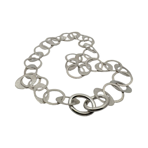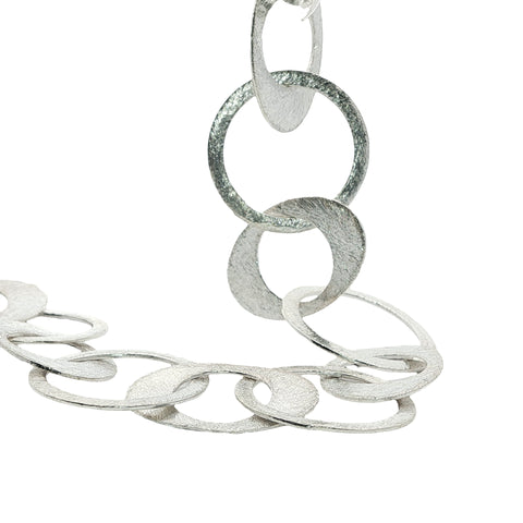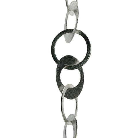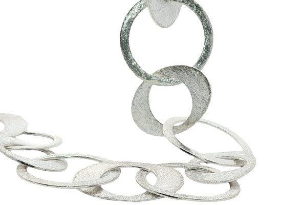 Jedes Glied wird von Hand gefertigt und vereint matte, ovale (ca. 17 X 24 mm) und runde Elemente (ca. 17 mm) zu einer lebendigen, organischen Kette mit skulpturalem Charakter.