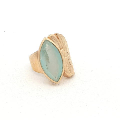 Im Zentrum steht ein navetteförmig geschliffener Aquamarin (ca. 10 x 20 mm), dessen hellblauer Schimmer an klares Wasser und weiten Himmel erinnert – ein Stein, der traditionell für Klarheit, innere Ruhe und Wahrhaftigkeit steht.