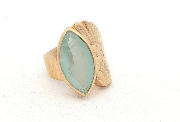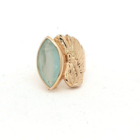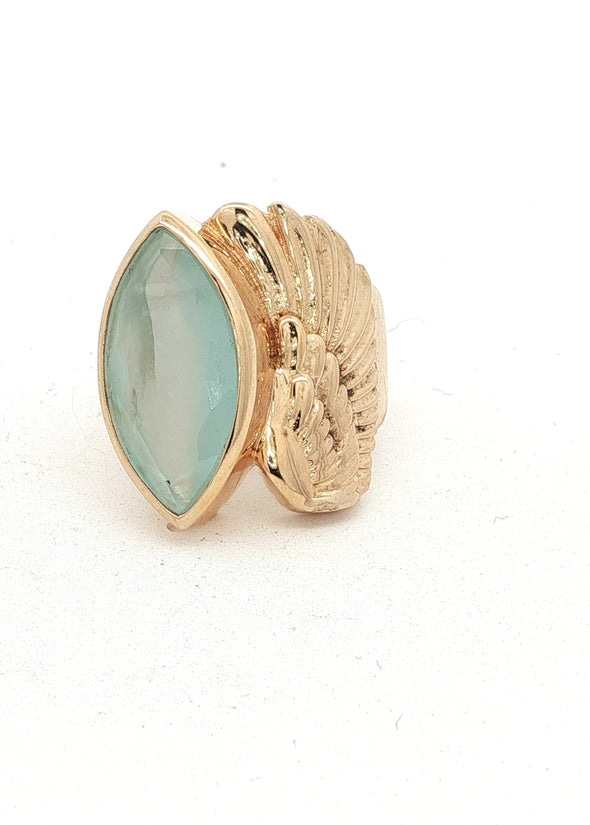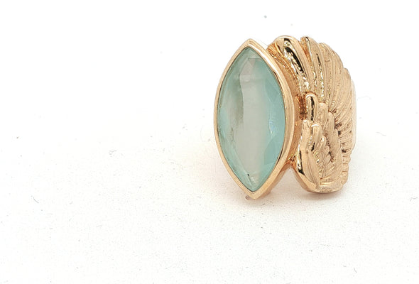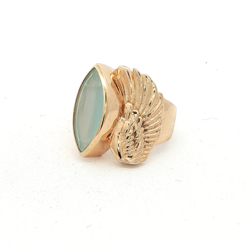 Besonders bedeutungsvoll: Ein fein ausgearbeiteter Engelflügel, der sich elegant an eine Seite des Steins anschmiegt. Er steht symbolisch für Schutz, Leichtigkeit, Intuition und geistige Führung – und verleiht dem Ring eine mystisch-spirituelle Note.